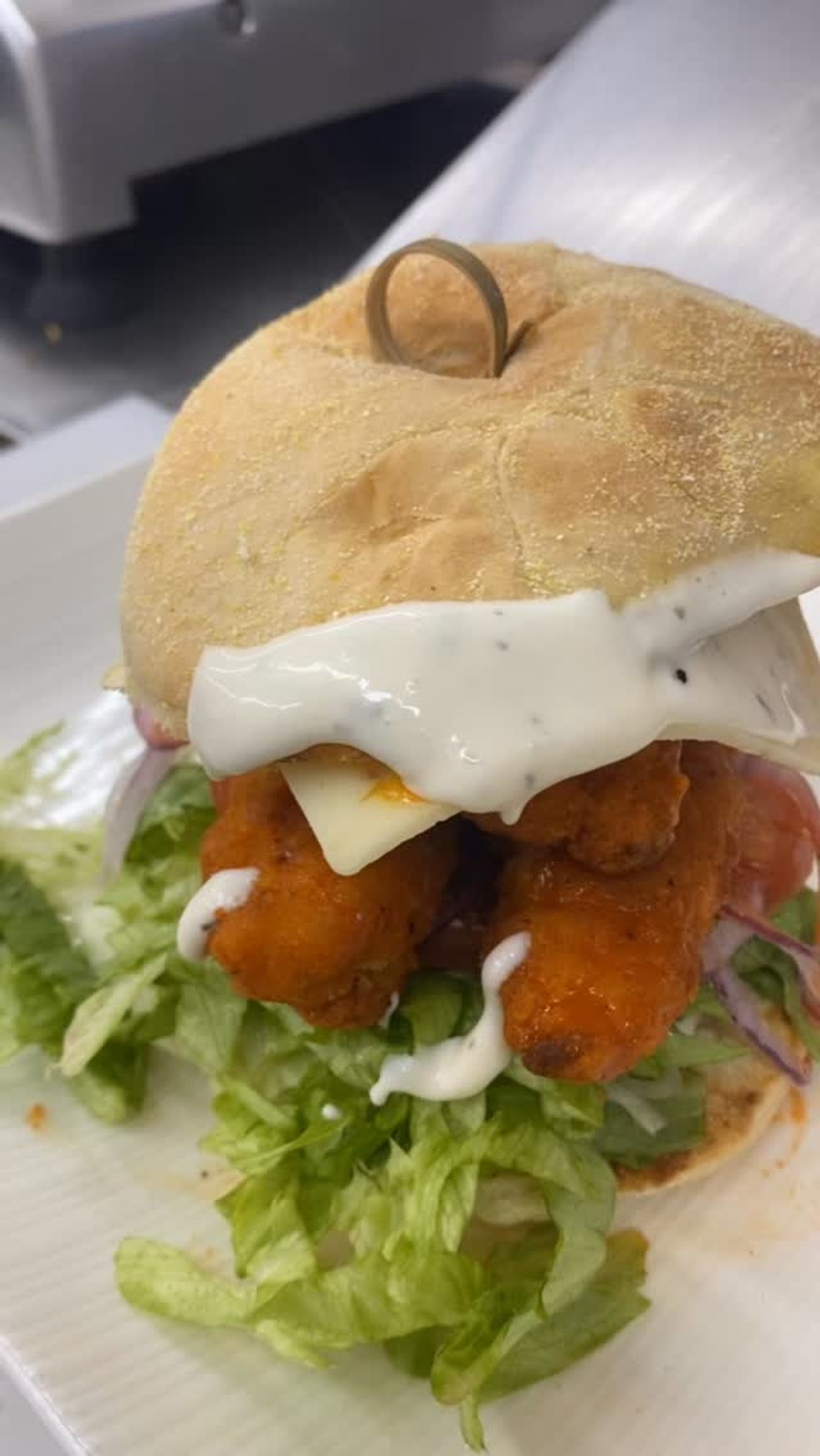 Best Buffalo Chicken Sandwich- House made Ranch & Buffalo Sauce, Pickles, Onions, Breaded & Baked Chicken Tenders Stacked High on a Bulky Roll