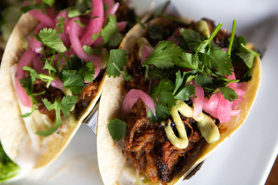 BBQ Chicken or Pork Your choice on a sandwich or in corn tortillas, Jalapeno Slaw, BBQ Sauce, Pickled Onions